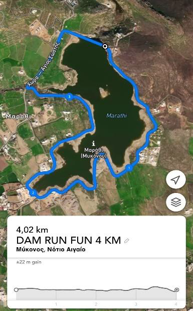 Η διαδρομή του FUN RUN 4 km είναι κυκλική και έχει κοινό σημείο εκκίνησης-τερματισμού τη γέφυρα του φράγματος. Στη συνέχεια, κατευθύνεται για 3 km σε χωμάτινο τερέν 75% και 1 km σε ασφάλτινο τερέν 25%. Στα 2 km( checkpoint- βραχιολάκι) παρέχεται τροφοδοσία(ΝΕΡΑ/ΙΣΟΤΟΝΙΚΟ ΠΟΤΟ/ΜΠΑΝΑΝΕΣ).