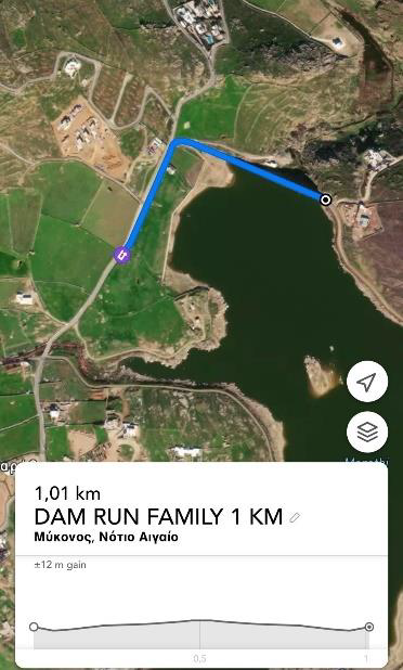 Στο FAMILY RUN 1 km όλα τα παιδιά τρέχουν για 500μ( checkpoint- βραχιολάκι) υποχρεωτικά μαζί με έναν τουλάχιστον γονέα με κοινό σημείο εκκίνησης- τερματισμού τη γέφυρα του φράγματος. Στη συνέχεια, κάνουν αναστροφή για 500μ και επιστρέφουν στο σημείο εκκίνησης-τερματισμού.