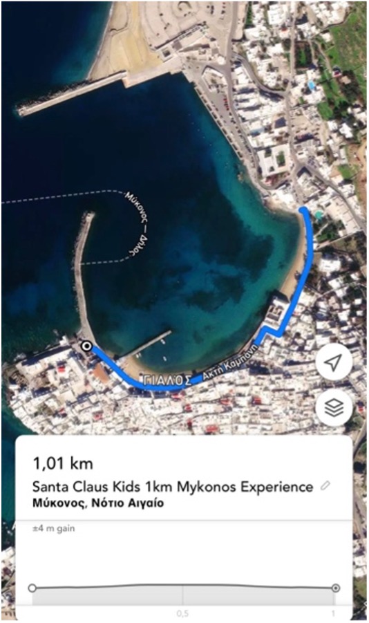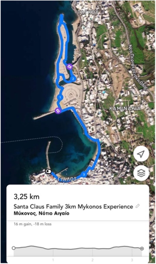 Ξεκινάμε από το Δημαρχείο Μυκόνου και τρέχουμε κατά μήκος του Γιαλού, φτάνοντας στην παραλία της Αγίας Άννας. Στη συνέχεια, κάνουμε αναστροφή (check point- βραχιολάκι), και επιστρέφουμε στο Δημαρχείο Μυκόνου.