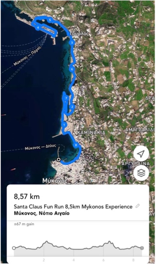 Σημείο εκκίνησης το Δημαρχείο Μυκόνου. Τρέχουμε κατά μήκος του Γιαλού και φτάνουμε στην παραλία της Αγίας Άννας. Στρίβουμε αριστερά προς την Κολοκύθα, φτάνουμε στο Παλιό Λιμάνι της Μυκόνου και κατευθυνόμαστε προς την προέκταση του parking του. Συναντάμε τον φάρο του parking (check point- βραχιολάκι), διασχίζουμε τη γέφυρα του Αλιευτικού Καταφύγιου και κατευθυνόμαστε αριστερά προς την Ταγκού. Φτάνουμε στην παραλία του Τούρλου και προχωράμε πολύ προσεκτικά στο παραλιακό κομμάτι που ενώνεται με το Νέο Λιμάνι, το οποίο είναι βραχώδες και ολισθηρό. Προσεγγίζουμε την μαρίνα του Νέου Λιμανιού τρέχοντας πάνω στο χωμάτινο κομμάτι της, κατευθυνόμαστε προς τα εκδοτήρια του taxi boat και τρέχουμε περιμετρικά του Νέου Λιμανιού κατευθυνόμενοι προς τον φάρο(check point- βραχιολάκι). Κατόπιν, επιστρέφουμε διανύοντας τον πεζόδρομο του Νέου Λιμανιού φτάνοντας ξανά στη μαρίνα, ακολουθούμε την ίδια διαδρομή έως τον φάρο του Παλιού Λιμανιού(check point- βραχιολάκι) και κατευθυνόμαστε προς το σημείου τερματισμού στο Δημαρχείο.